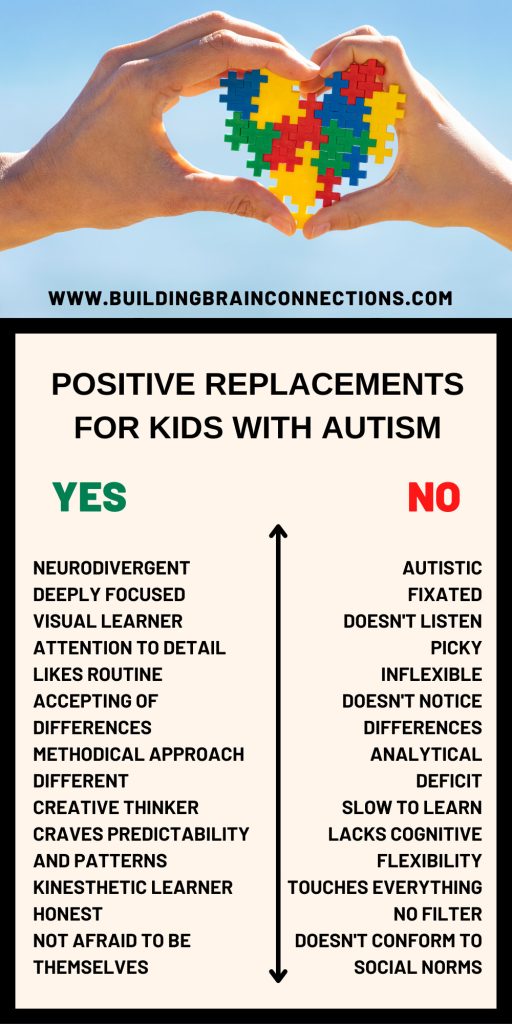 - How We Speak About Autism Itself – the language we use to describe autism can be negative or positive depending on what words we choose and may even affect our perception of how we see our child. Learning of and using the more positive terms are important for both interactions between you and for others listening.