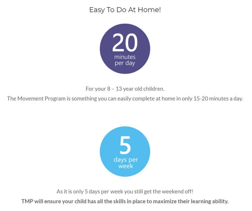 The Movement Program provides an easy-to-follow program with daily videos for you and your child to follow along with. Each daily video (5 days a week) takes 20 minutes and can be done without specialized equipment and in the comfort of your home.