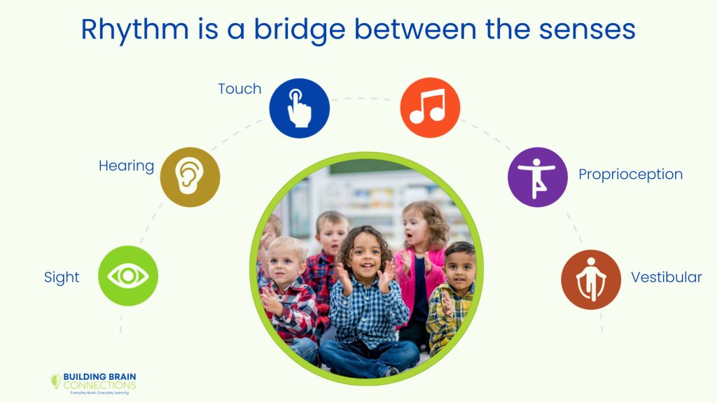 When you add music to movement — especially steady, predictable beats — you activate a powerful combination of auditory, vestibular, and proprioceptive input. These systems together help children: